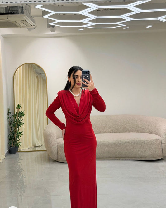 Degaje Yaka Uzun Elbise Kırmızı