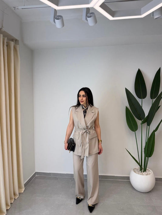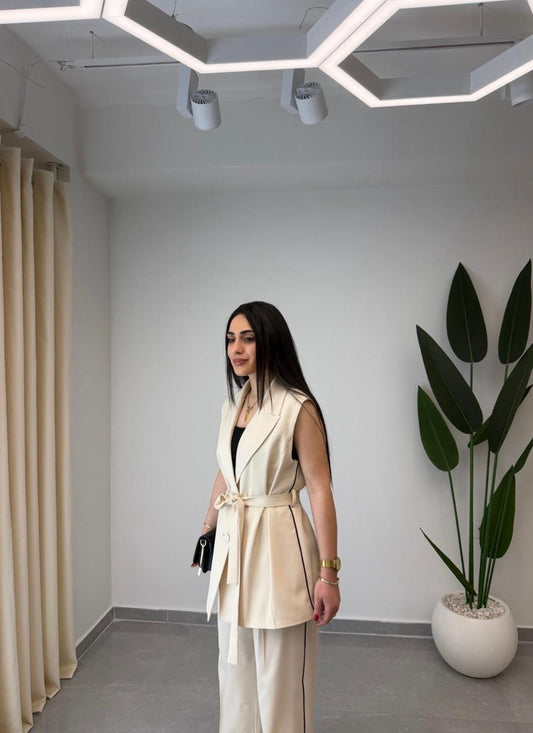 Düğmeli Kuşaklı Yelek-Pantolon İkili Takım