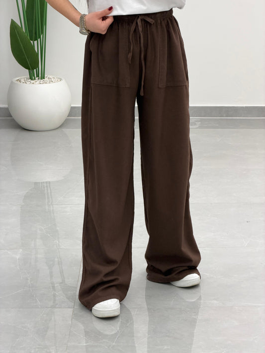 Bol Paça Yüksek Bel Tensel Palazzo Pantolon Kahve