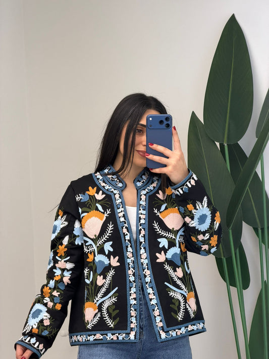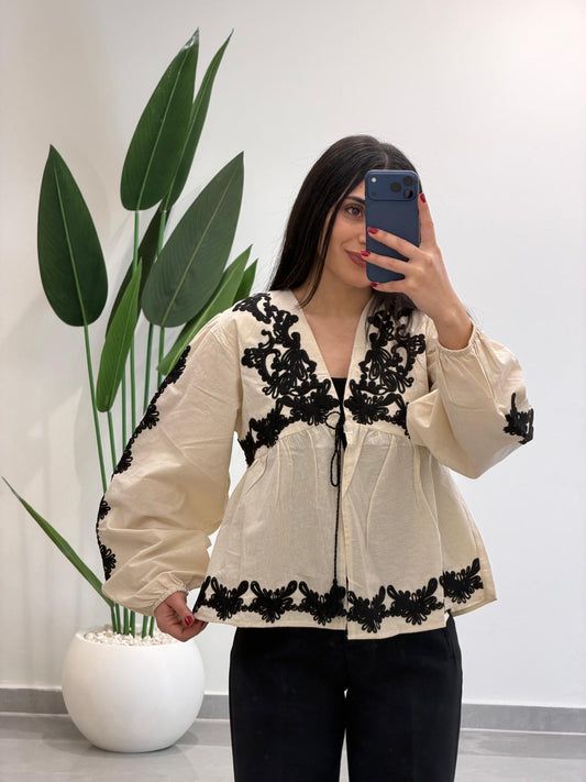 Nakışlı Bağlama Detaylı Balon Kol Ceket
