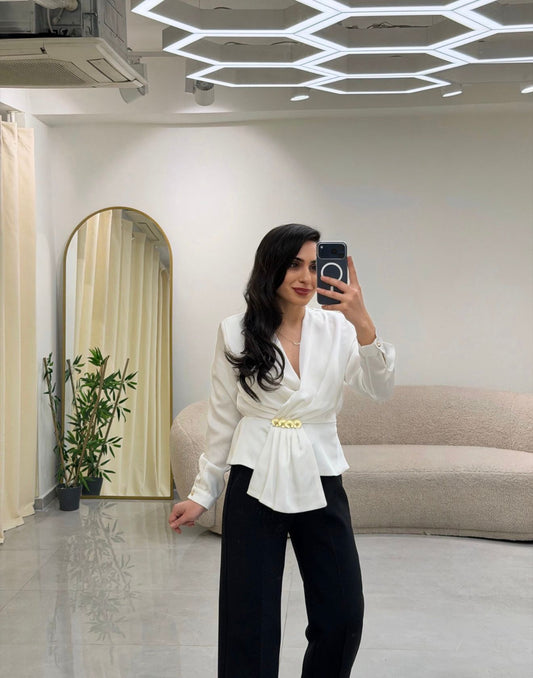 Kruvaze Yaka Broş Detaylı Bluz Beyaz
