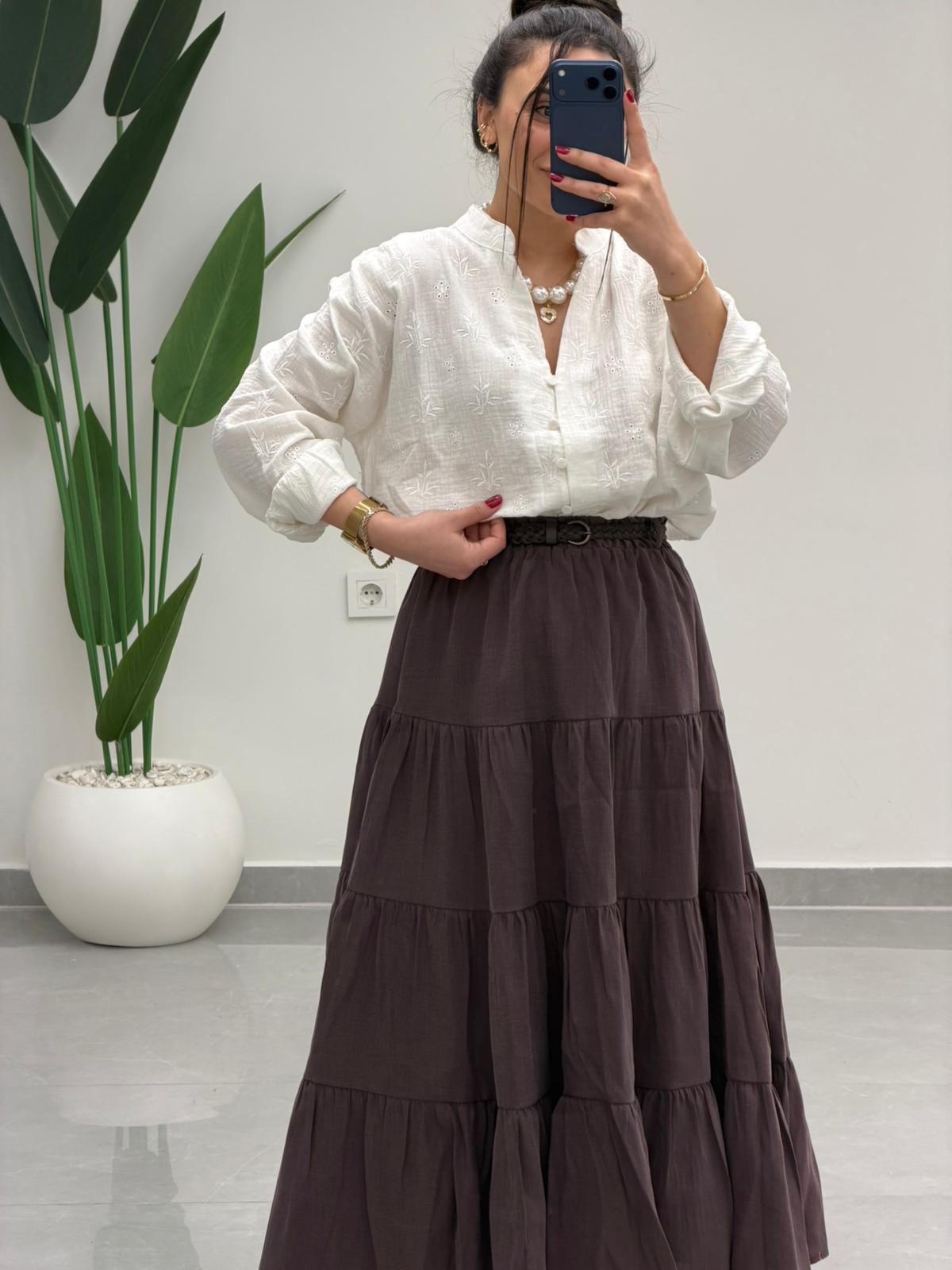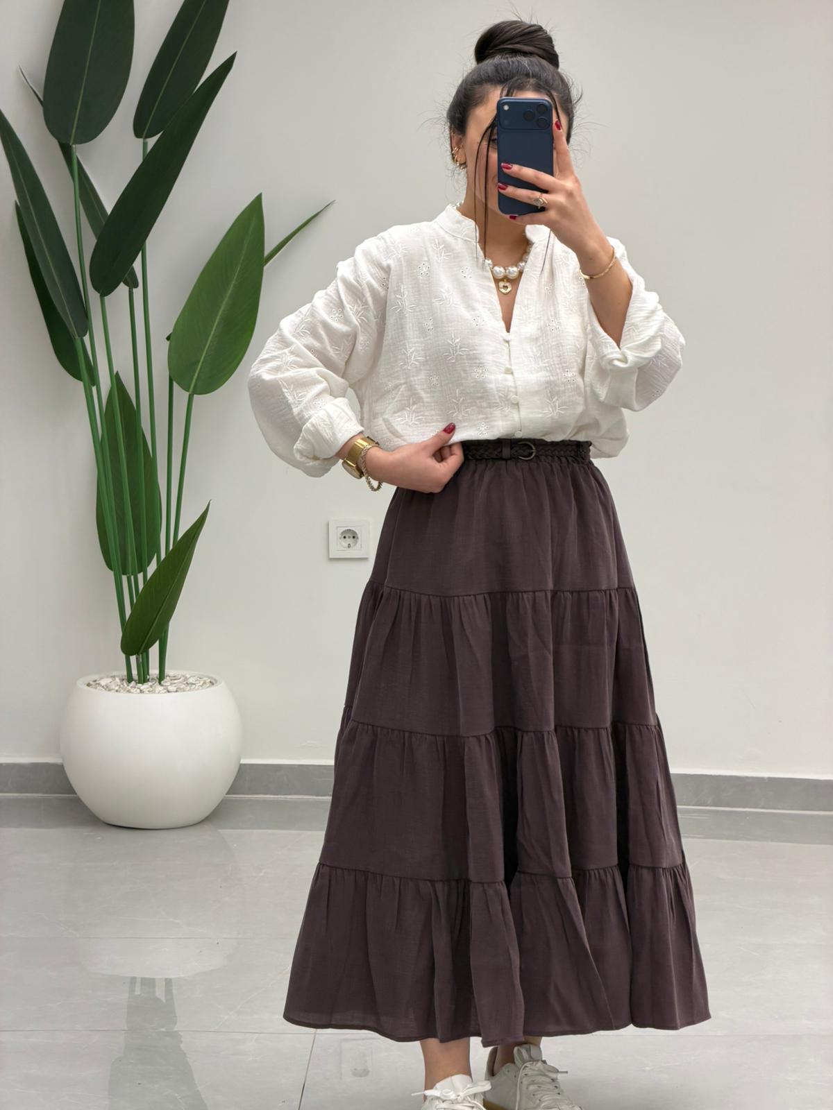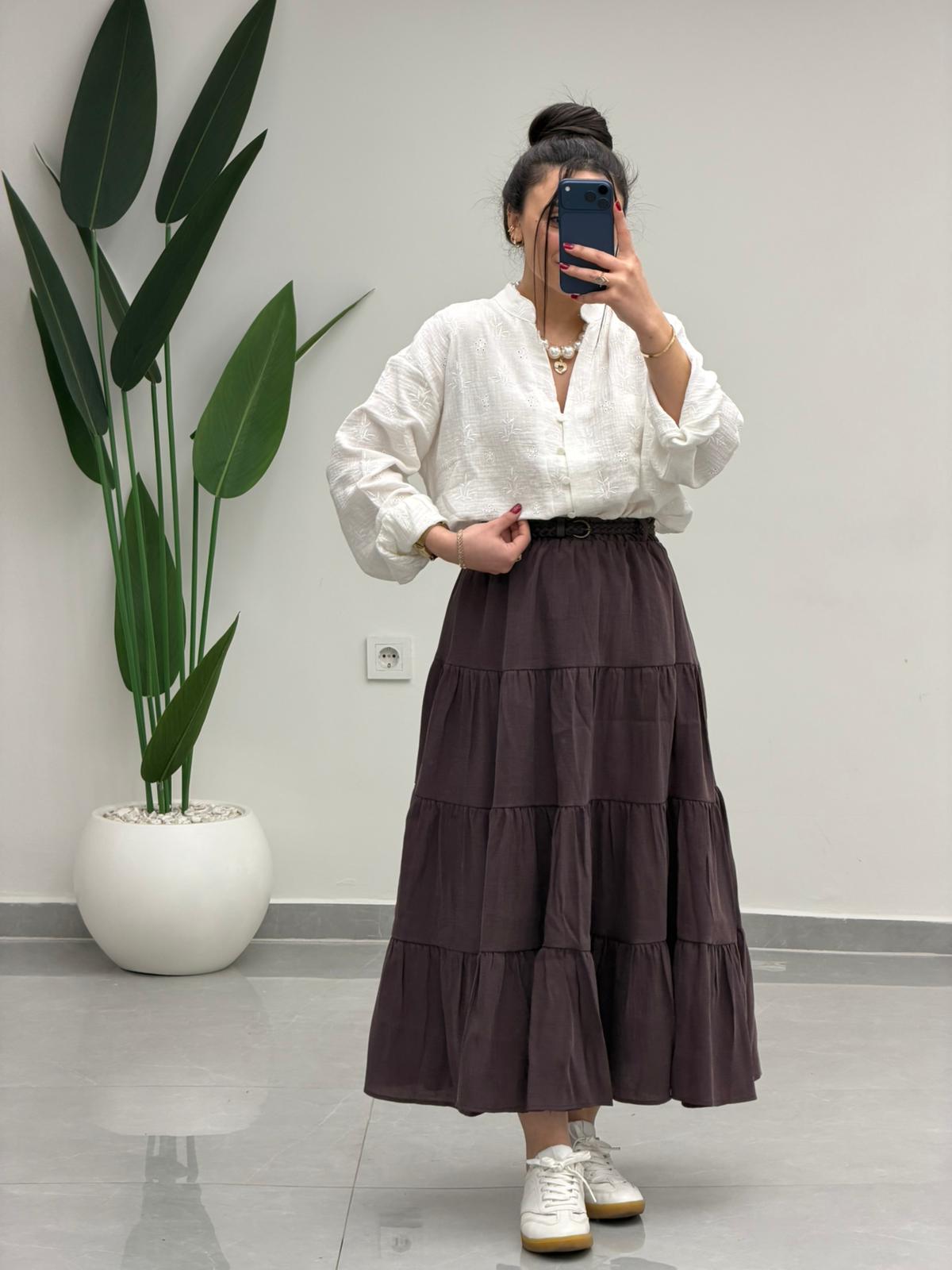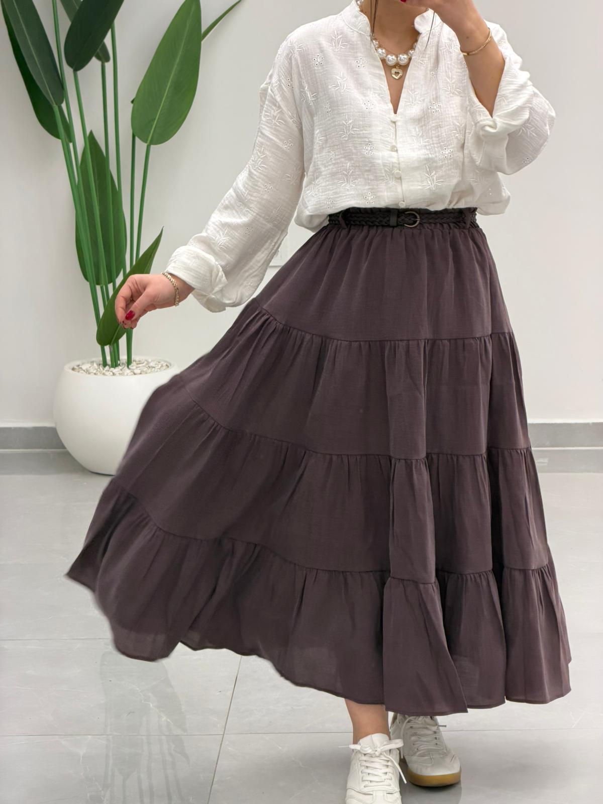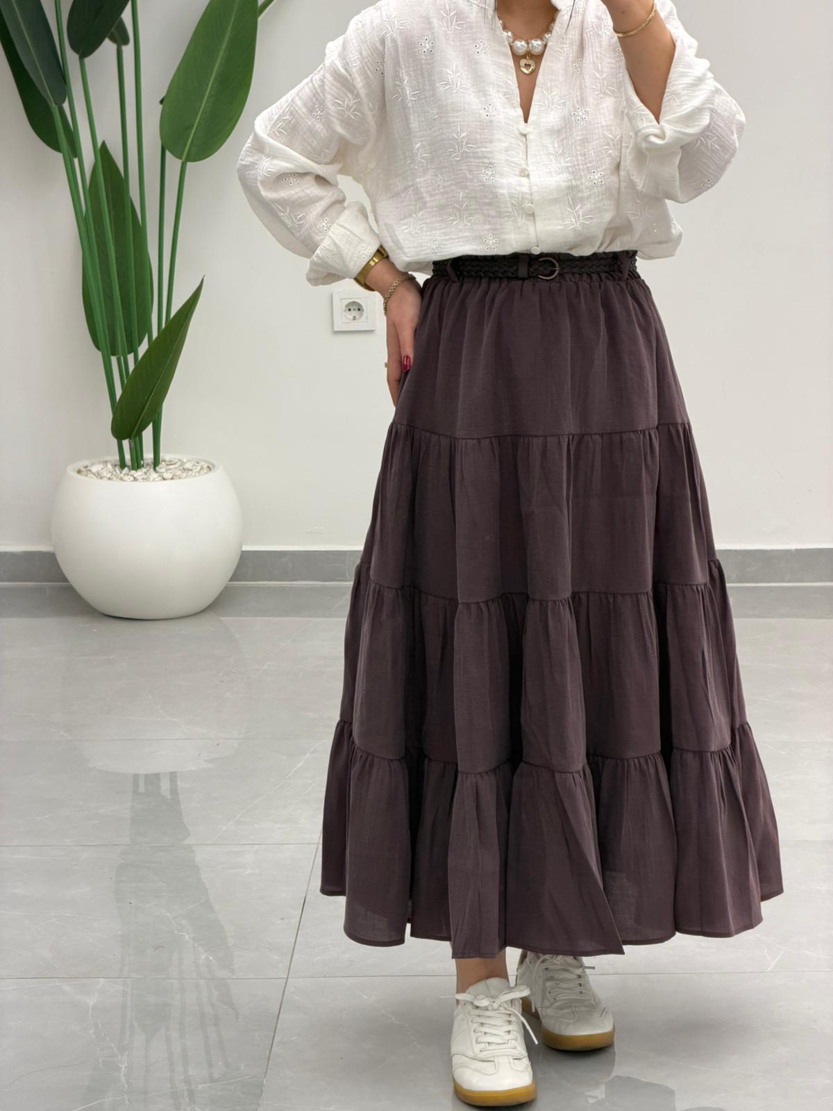 Beli Lastikli Kemerli Kloş Etek Kahve
