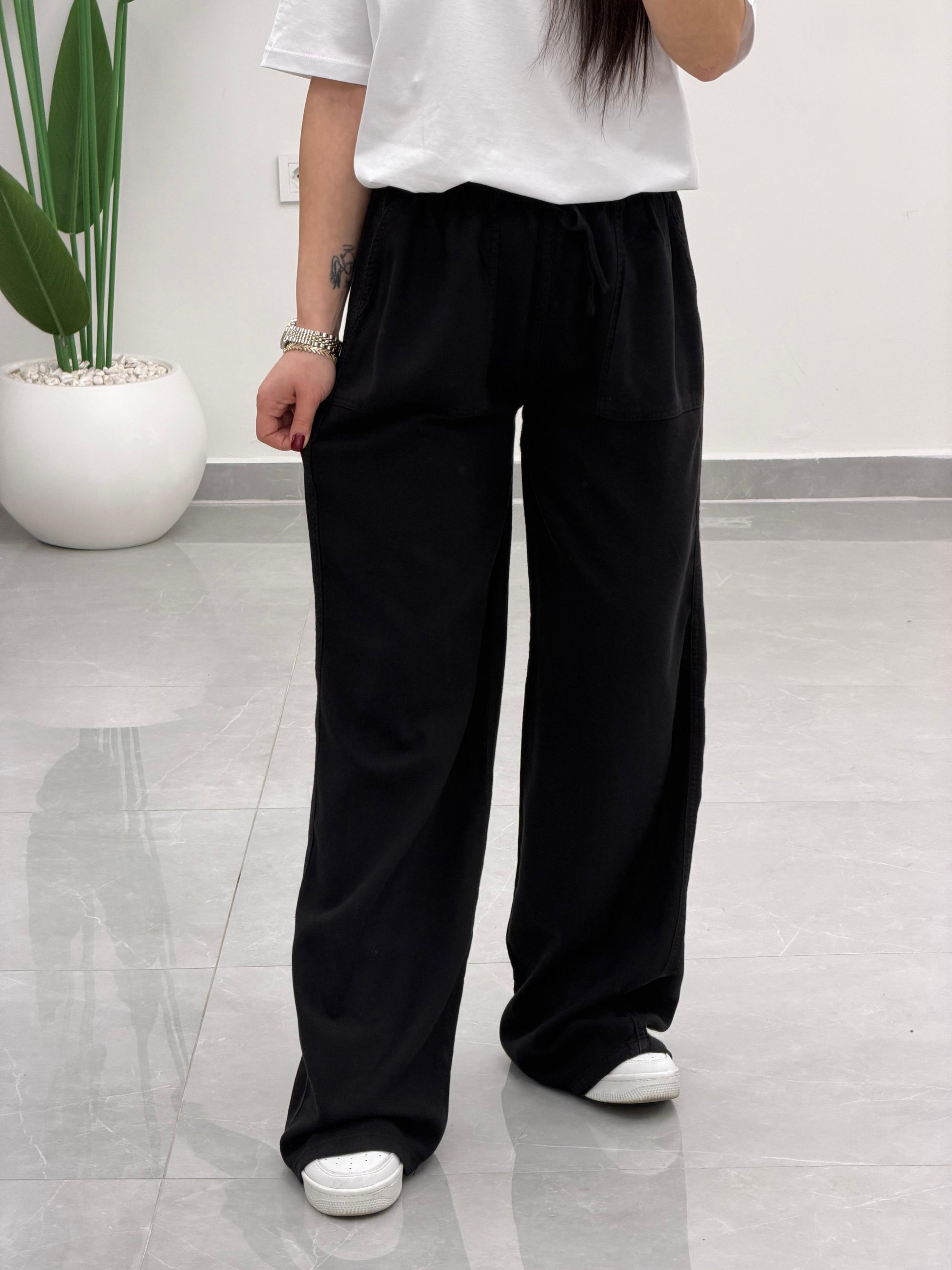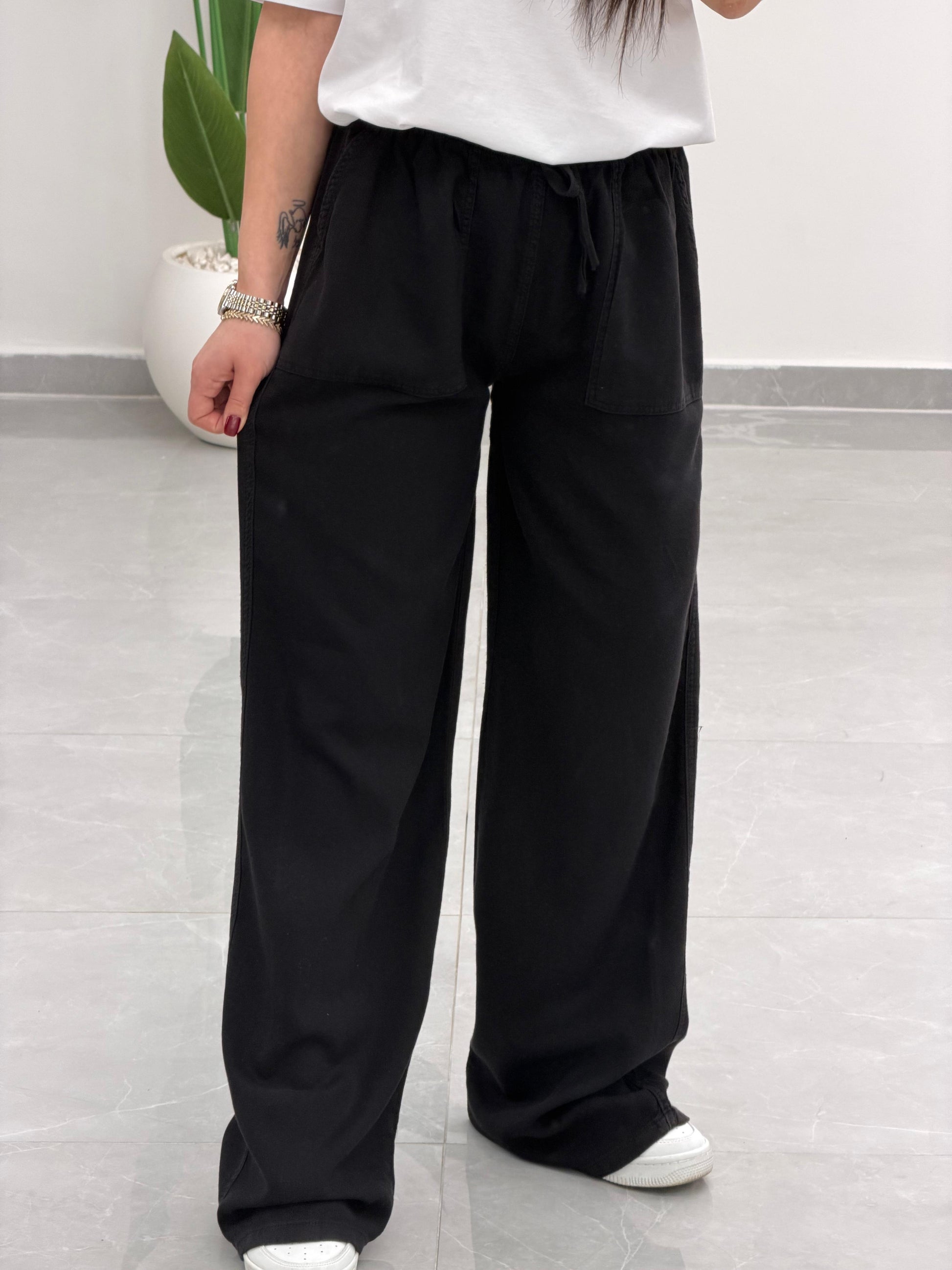 Bol Paça Yüksek Bel Tensel Palazzo Pantolon Siyah
