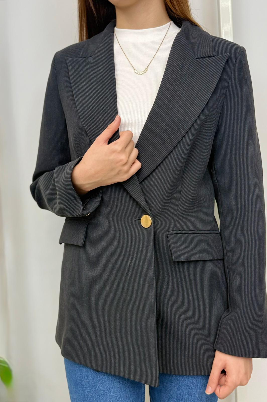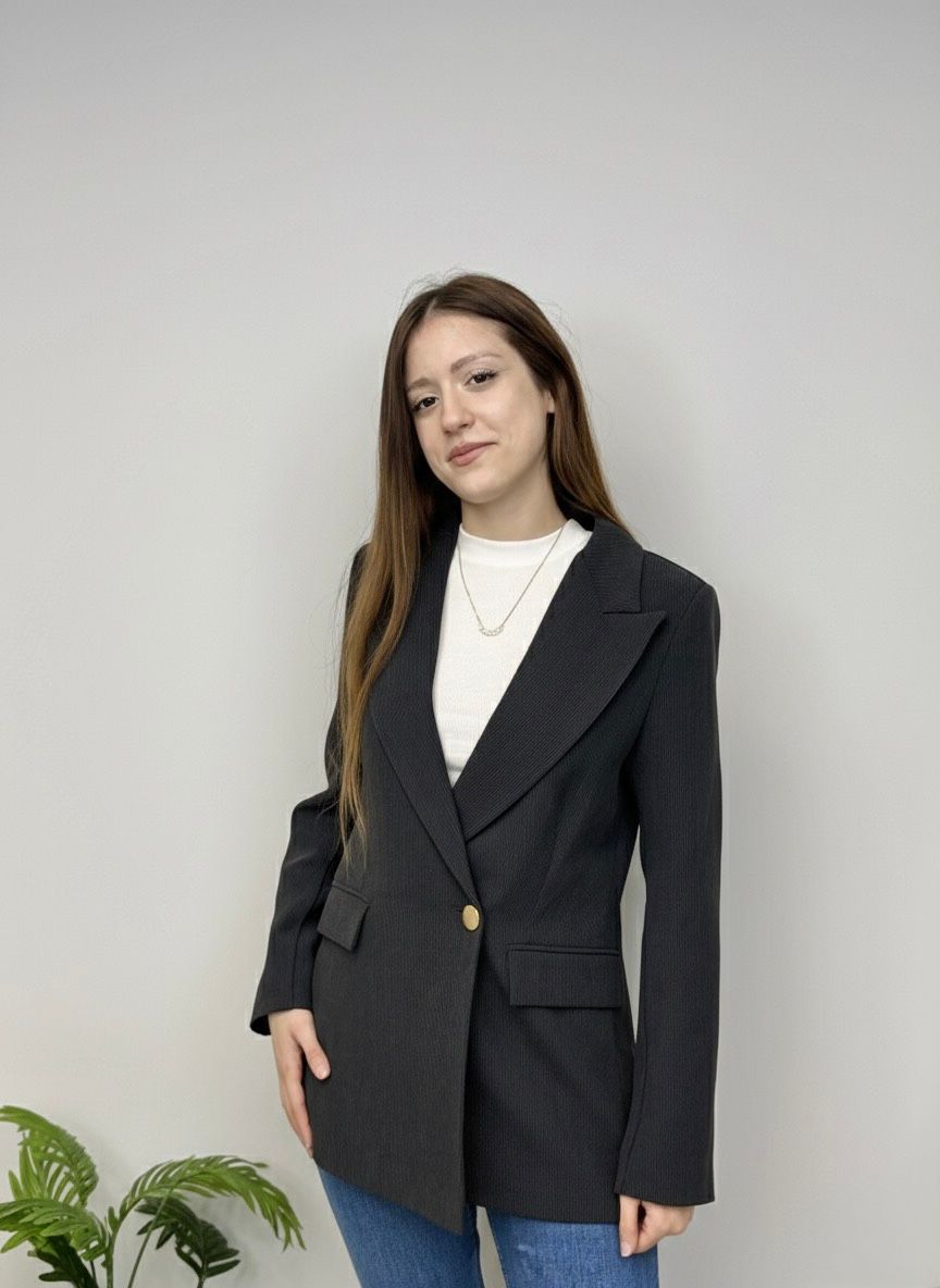 Modern ve zarif çizgileriyle dikkat çeken bu lacivert blazer ceket, günlük ve iş kombinlerinizin vazgeçilmezi olmaya aday. Klasik yaka kesimi ve tek düğmeli tasarımıyla şık bir görünüm sunarken, rahat kalıbı sayesinde gün boyu konfor sağlar.