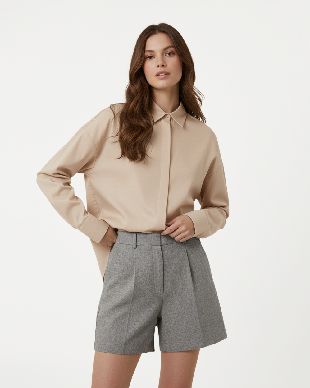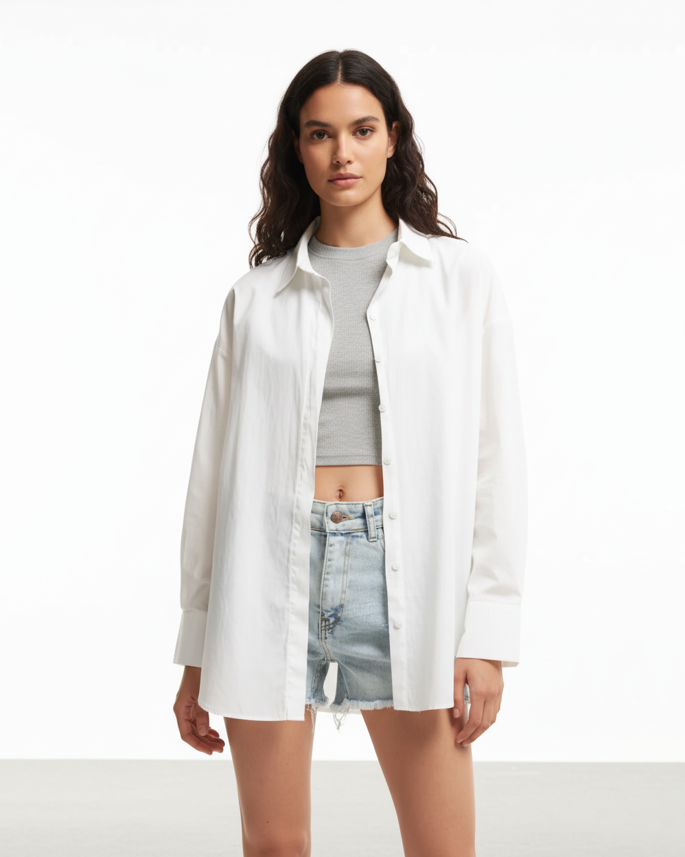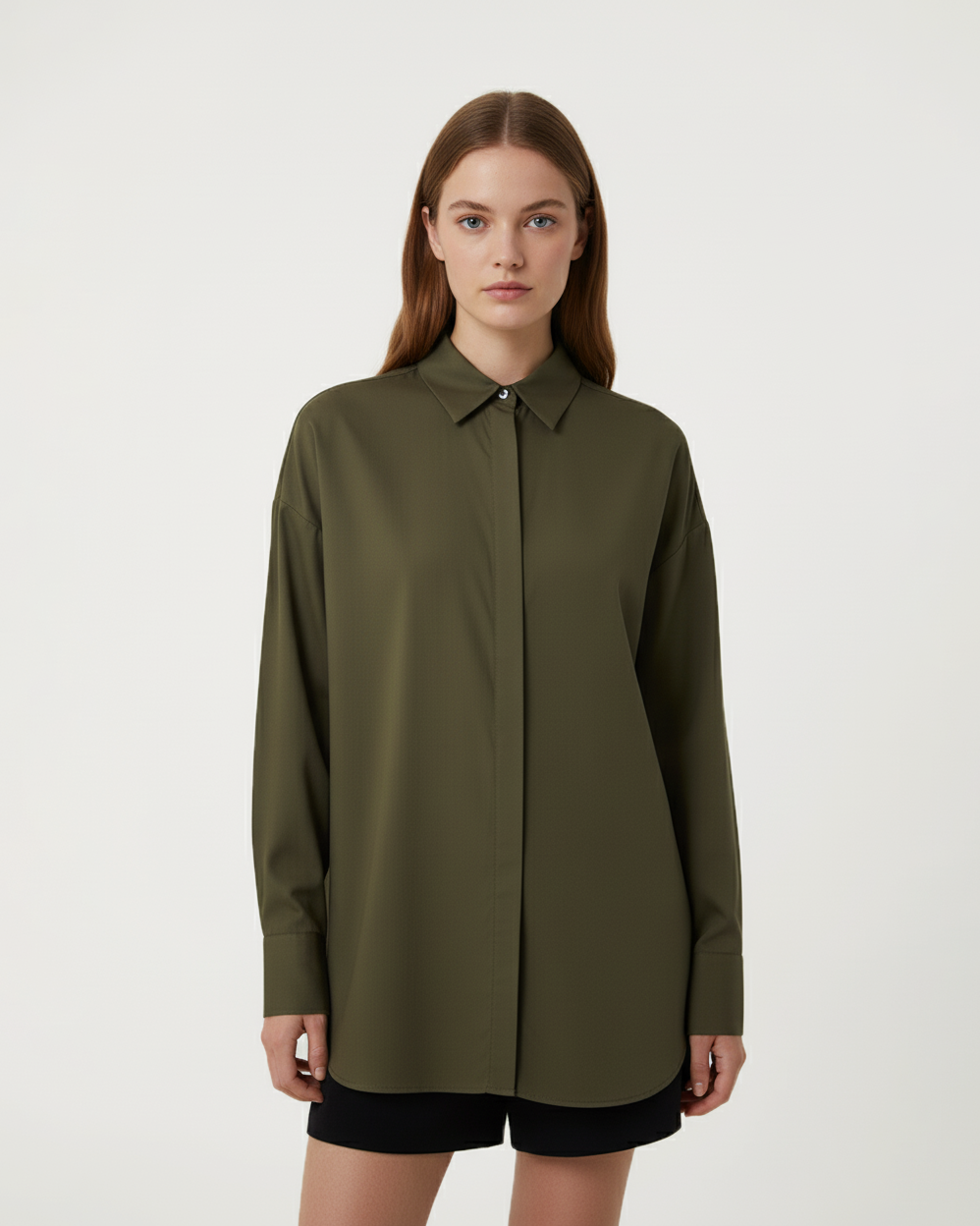 Uzun kollu oversize gömlek. Gizli patlı düğme kapamalı ön. Klasik yaka.