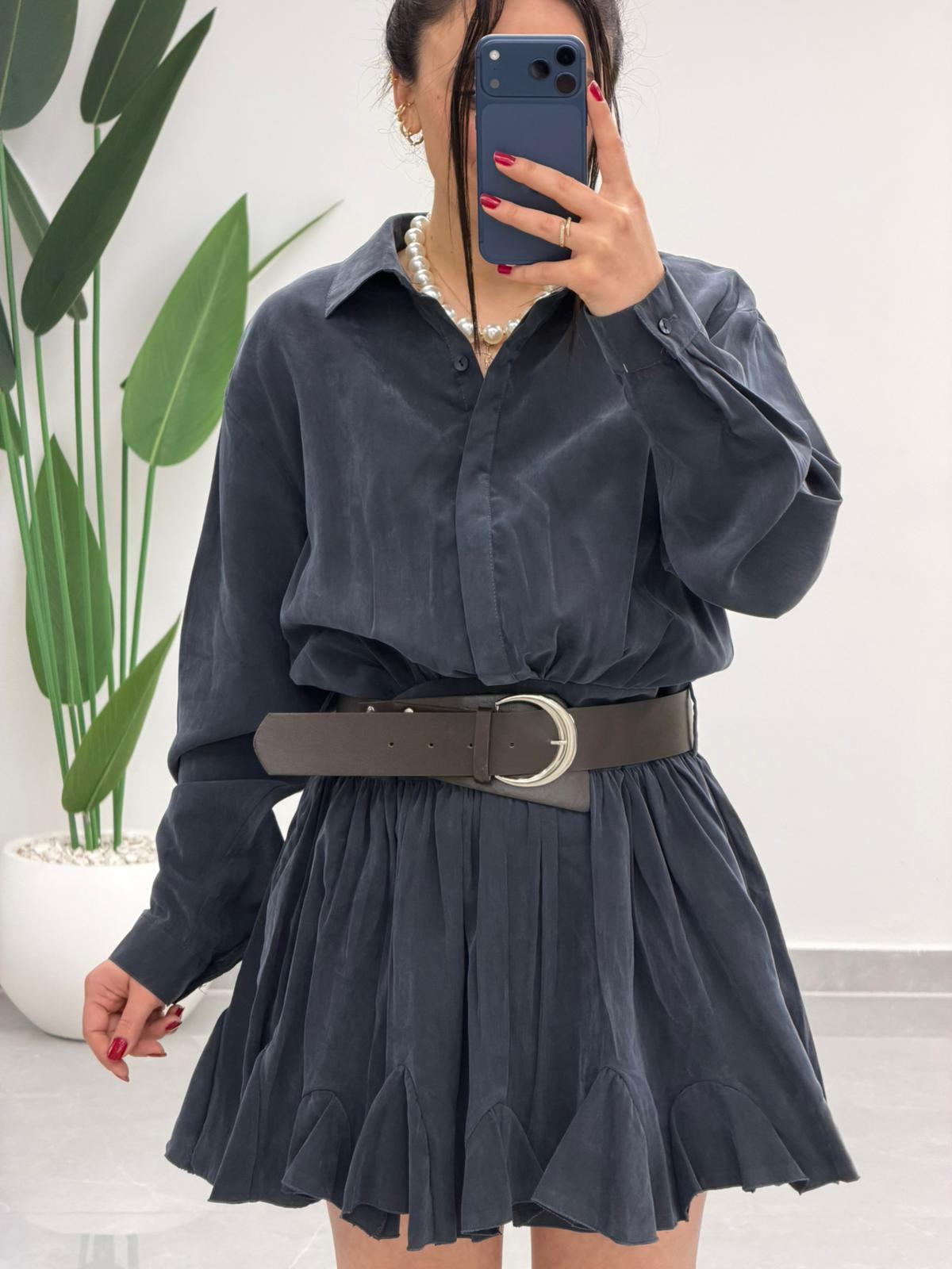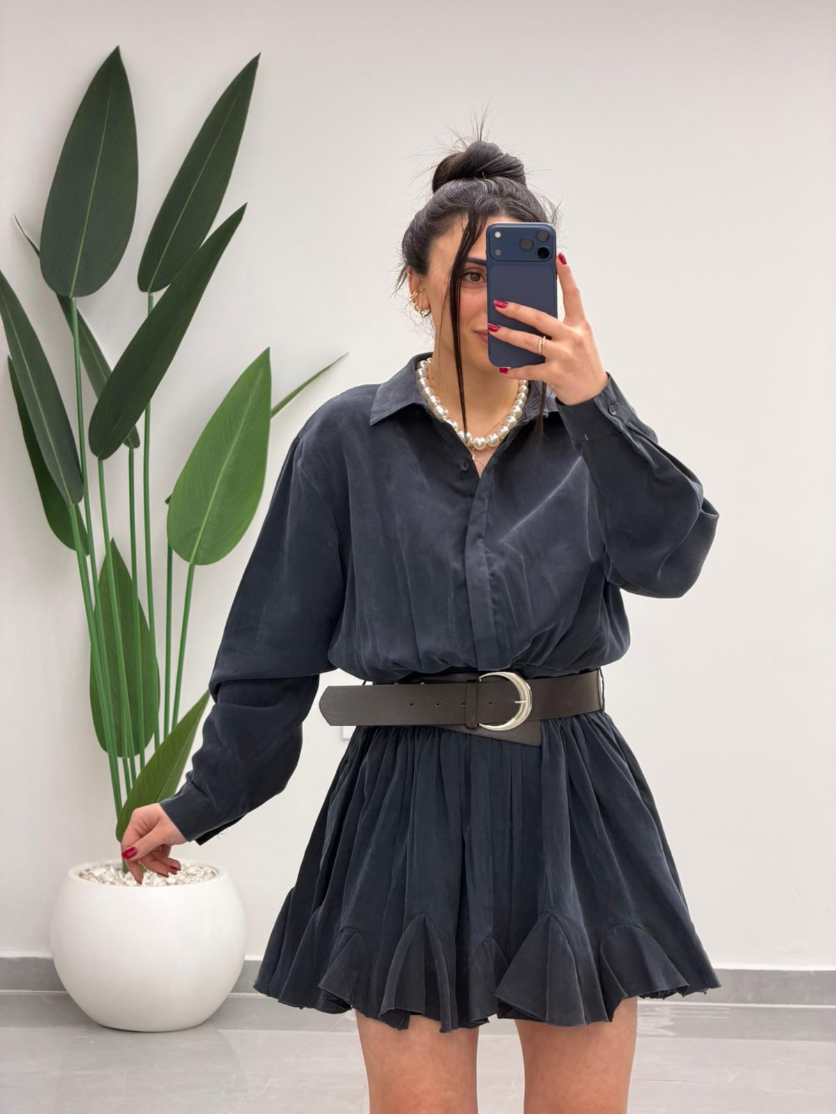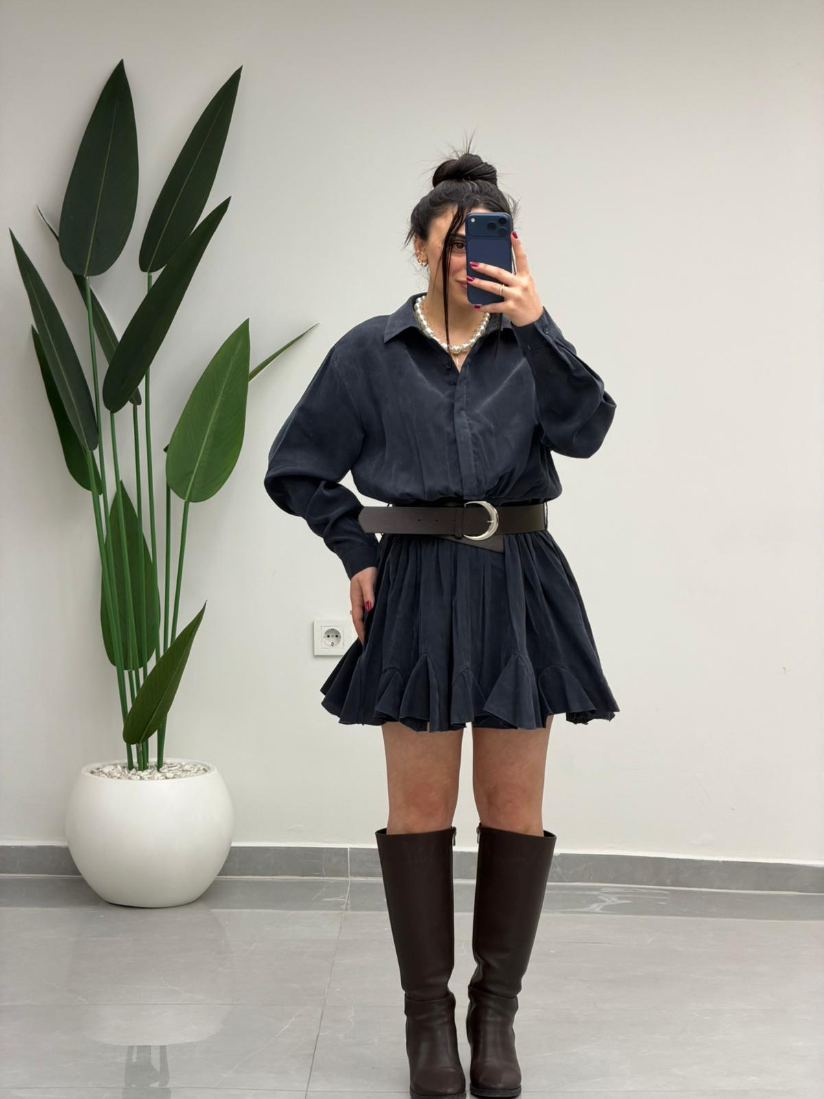 Kemer Detaylı Piliseli Tensel Mini Elbise Lacivert