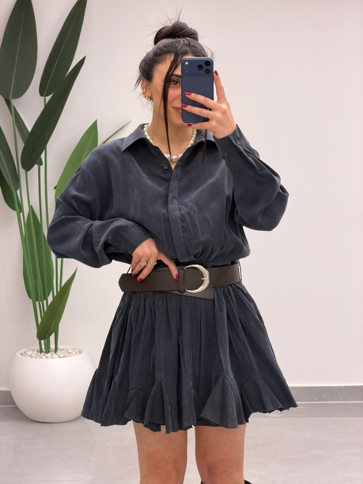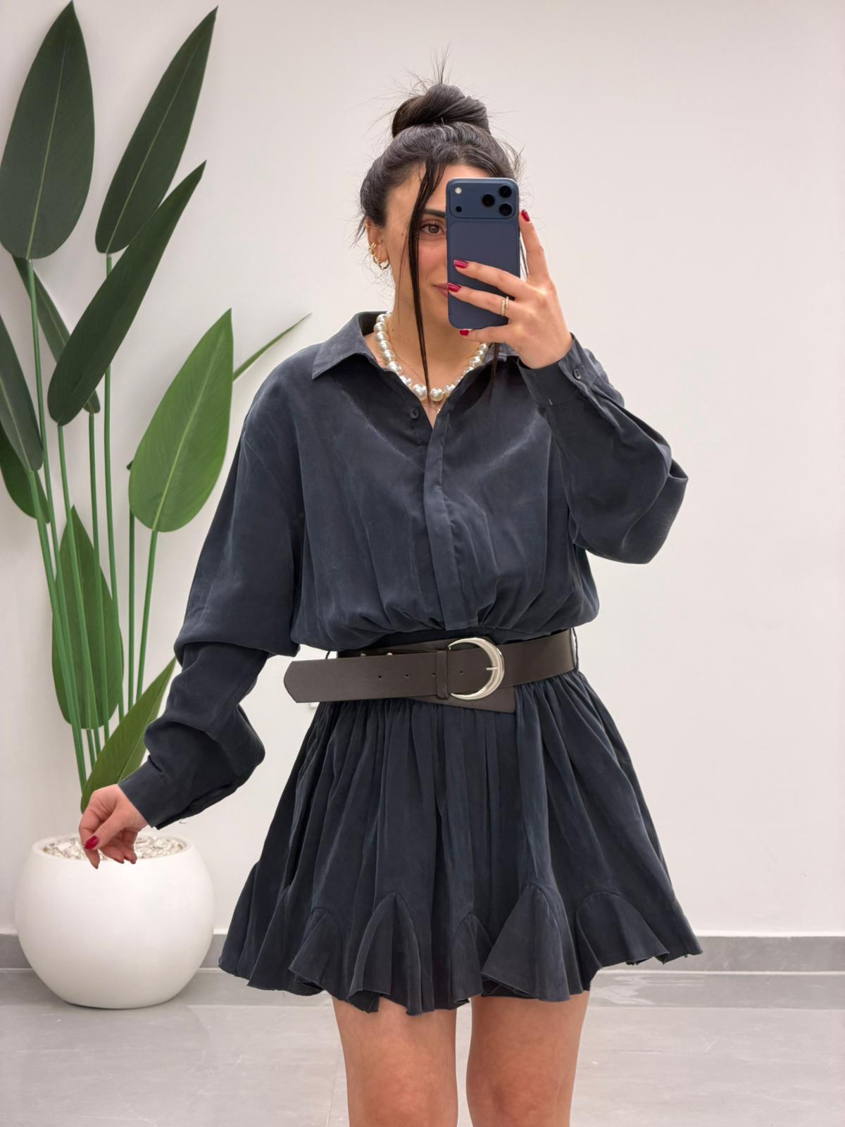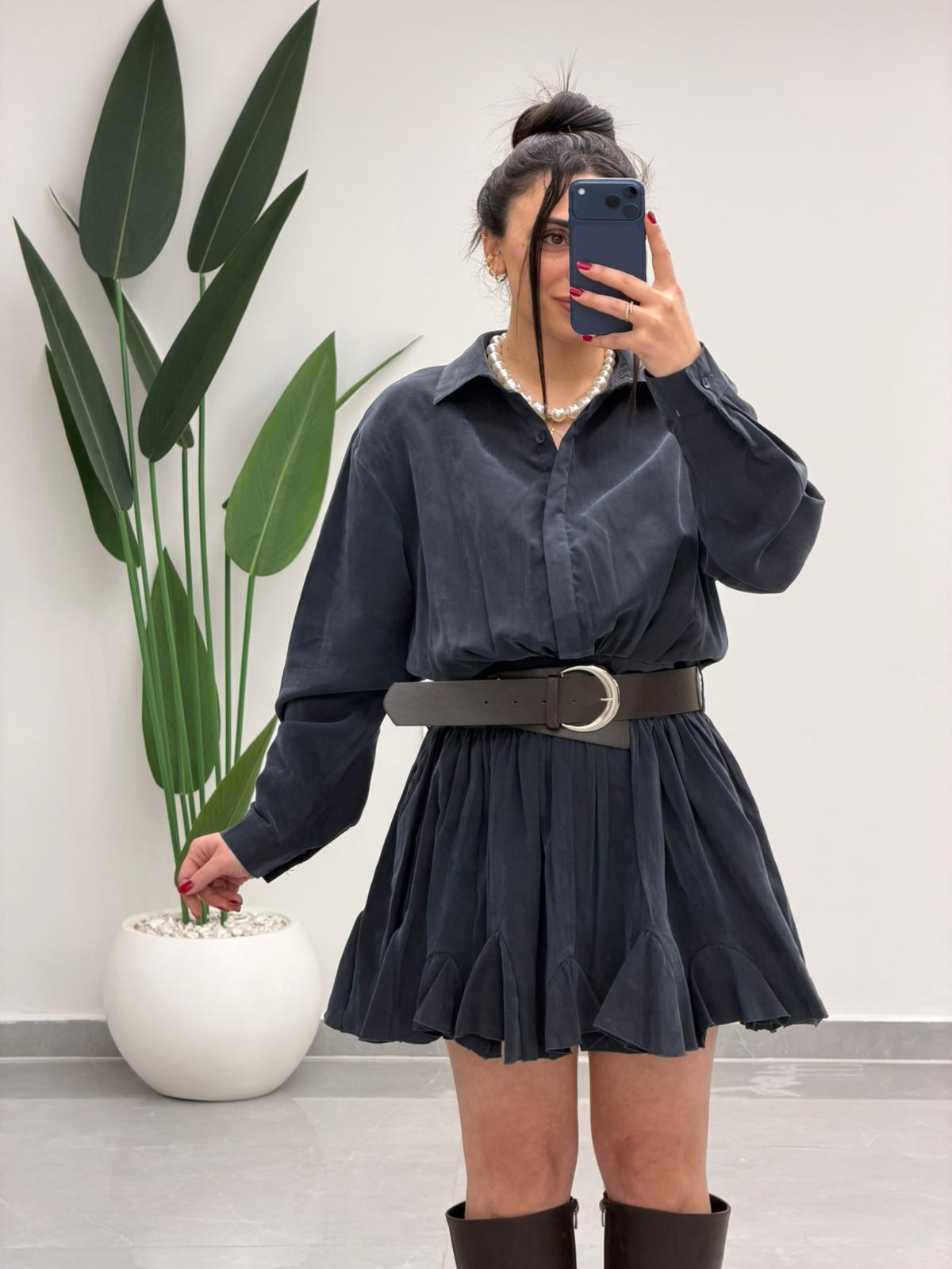 Kemer Detaylı Piliseli Tensel Mini Elbise Lacivert
