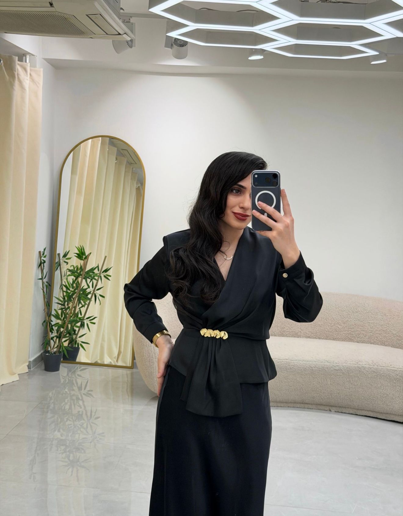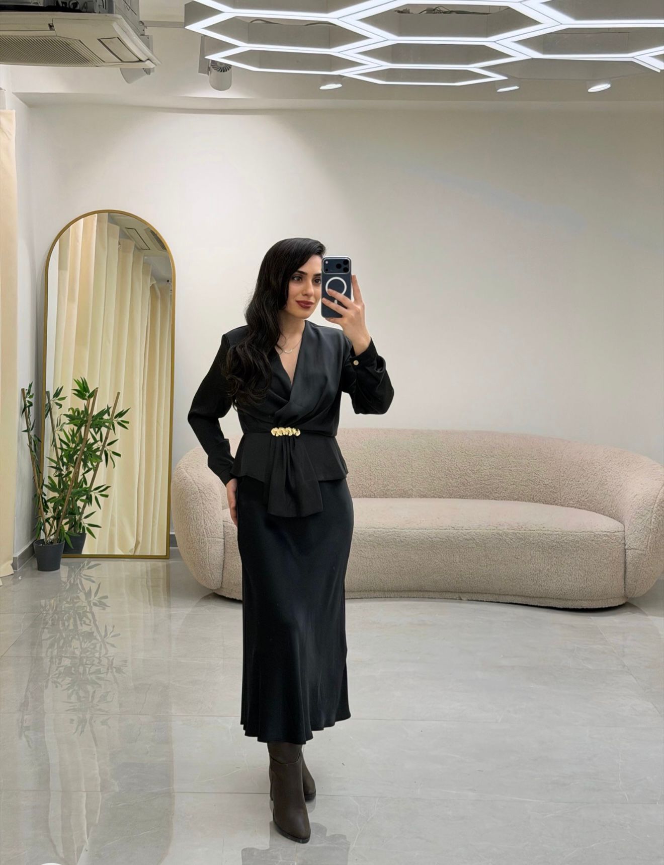 Kruvaze Yaka Broş Detaylı Bluz Siyah