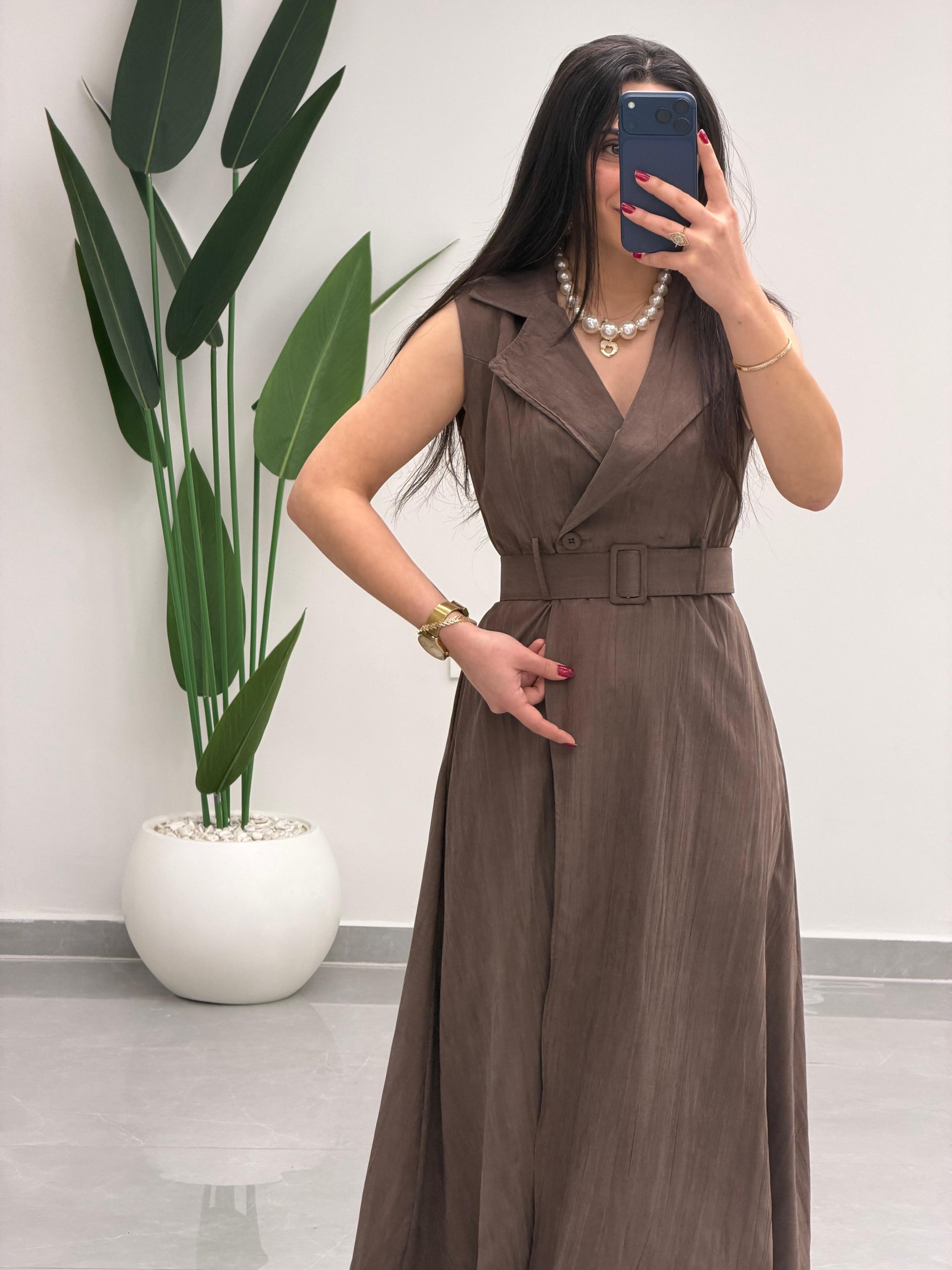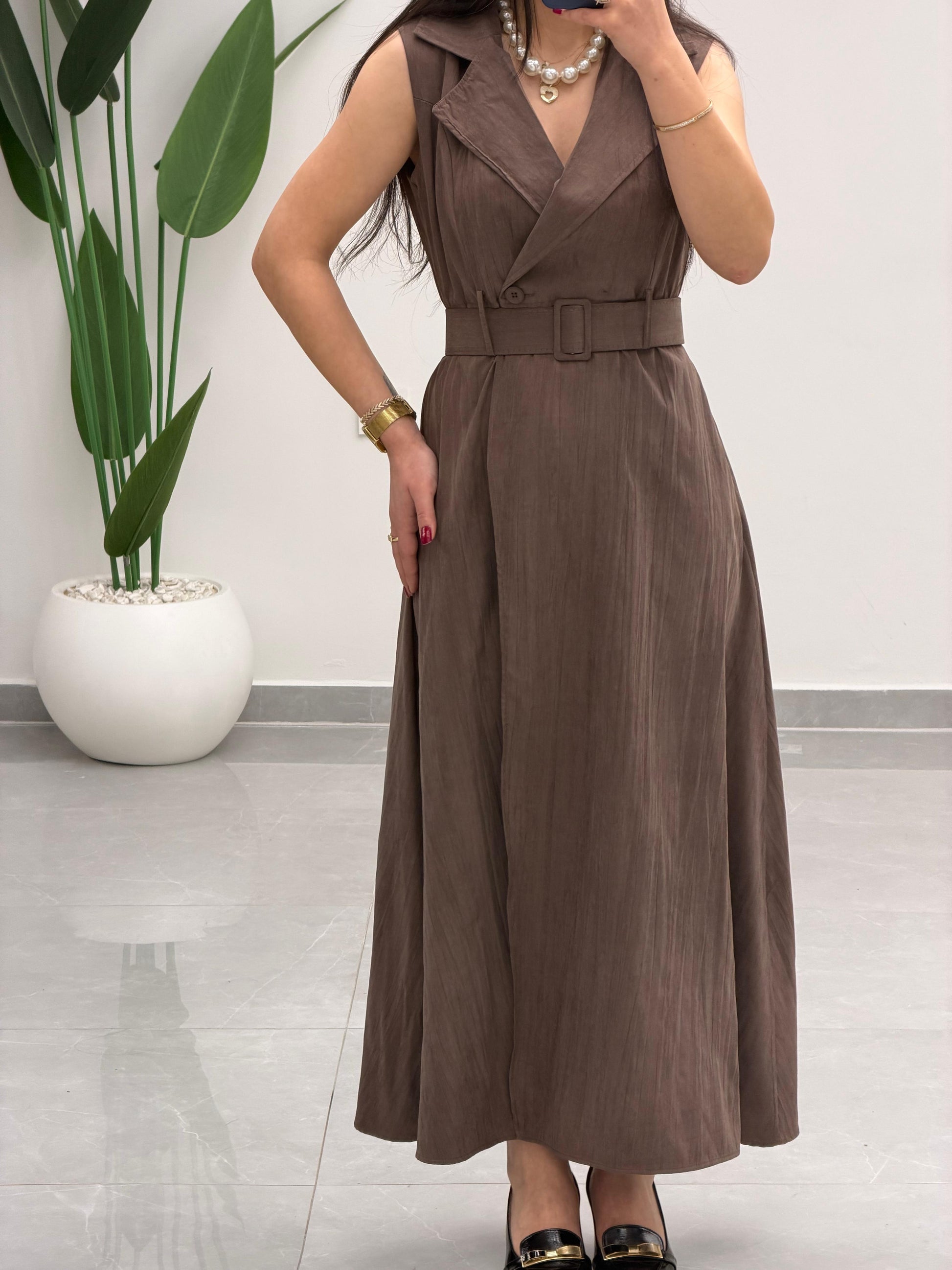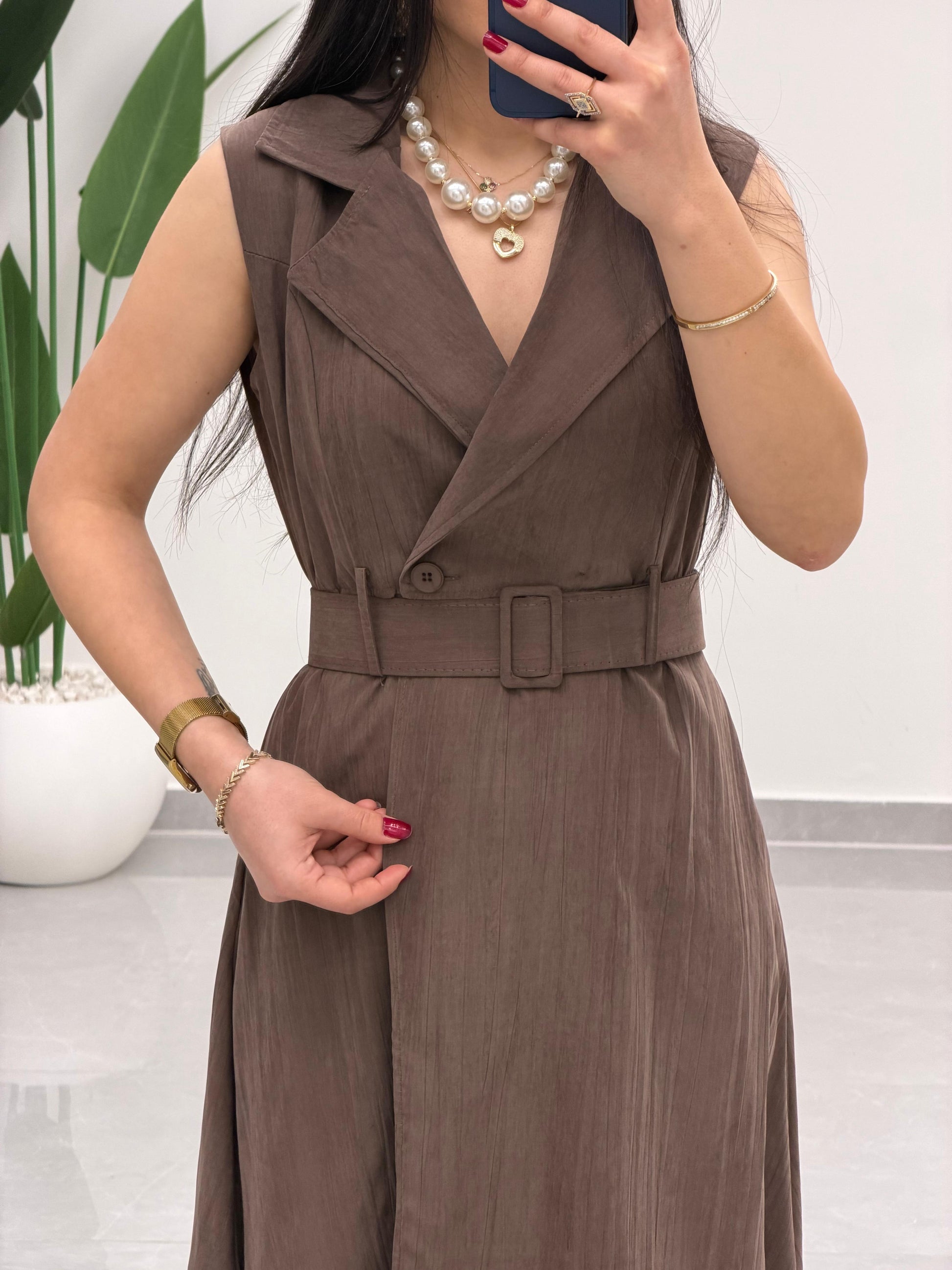 Kruvaze Yaka Kemerli Elbise Kahverengi