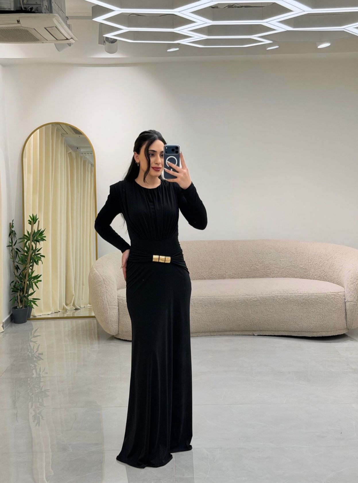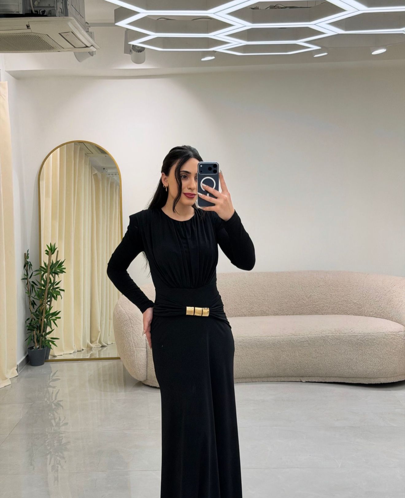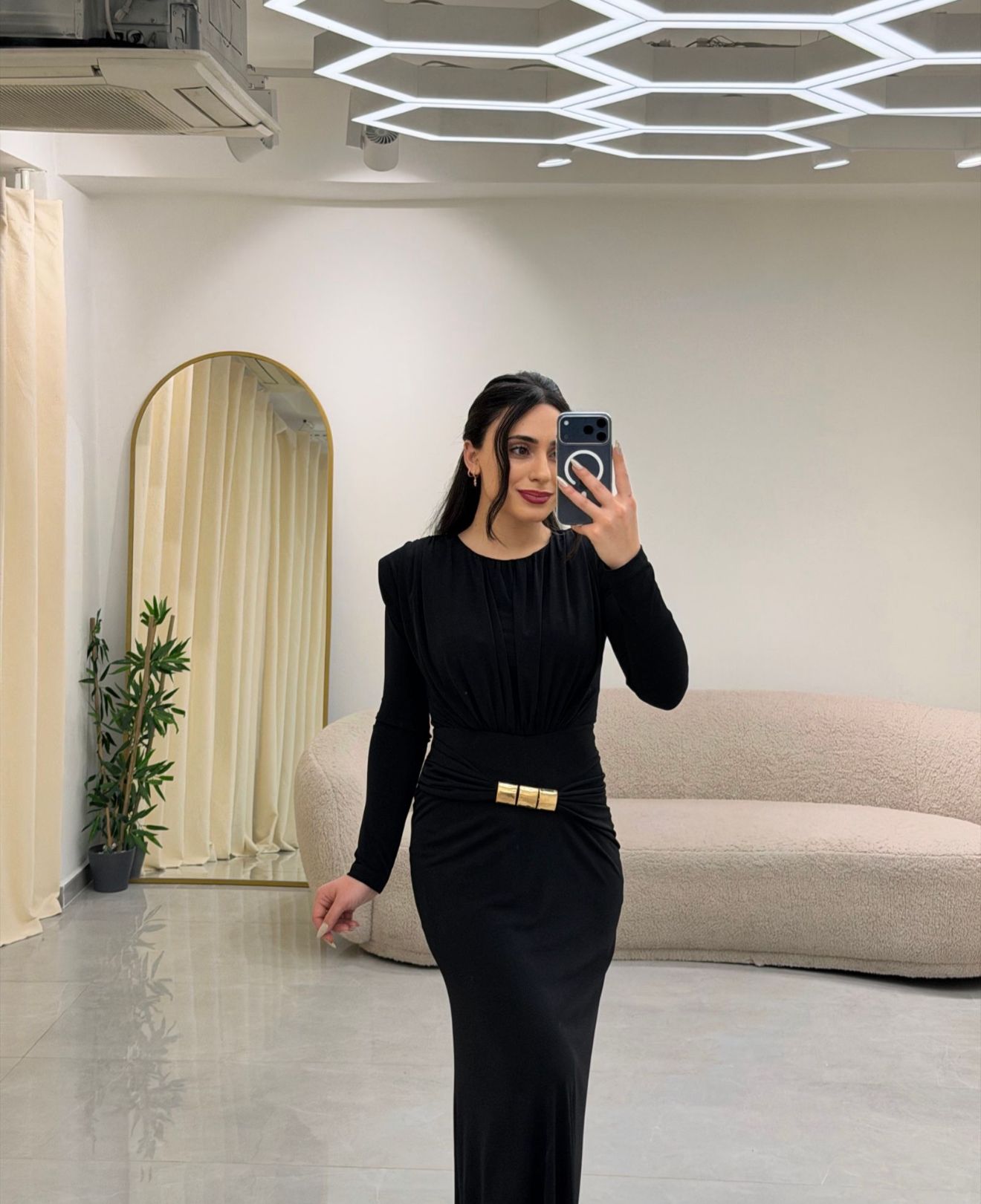 Omuz Vatkalı Bel Aksesuar Elbise Siyah