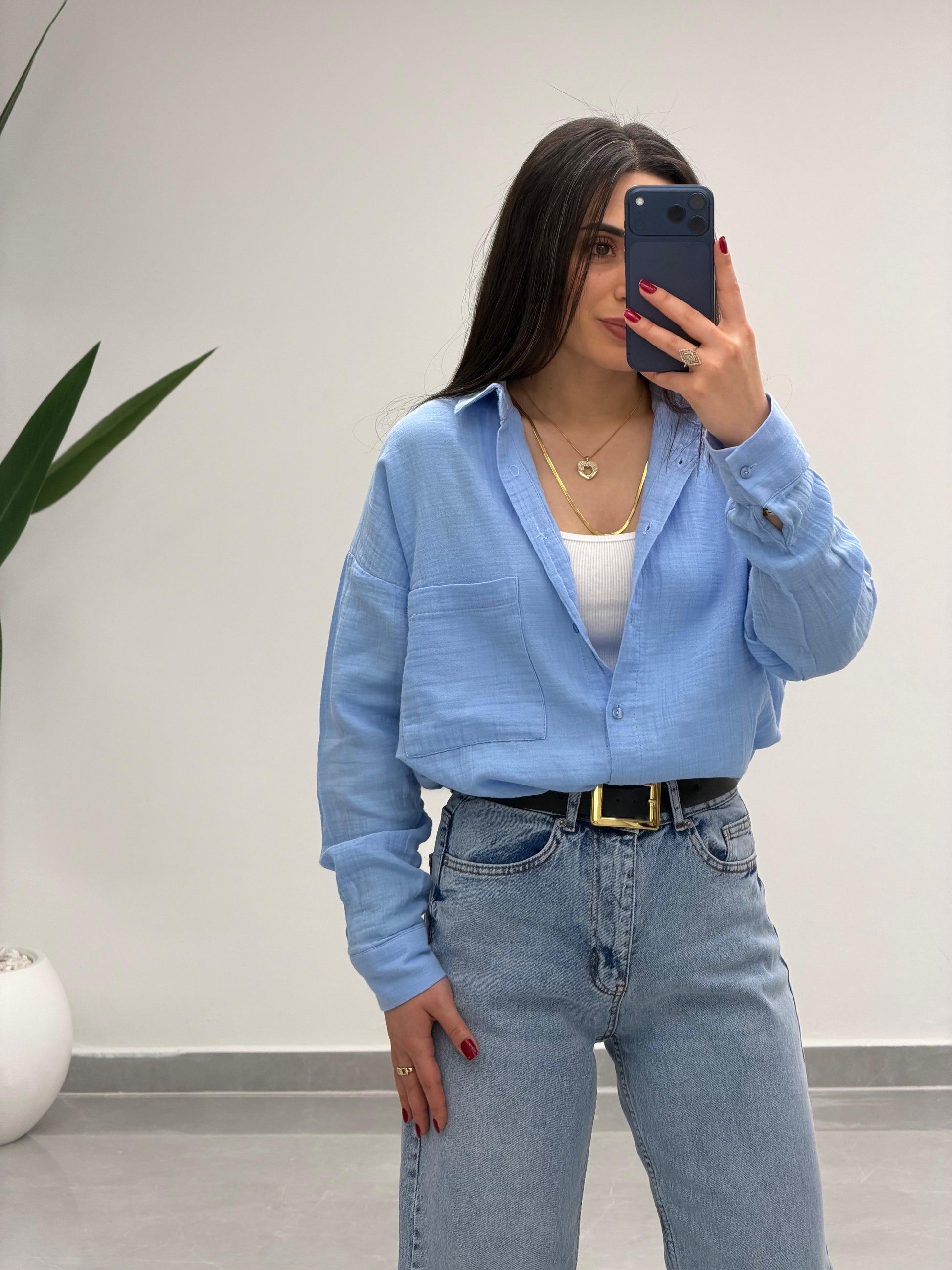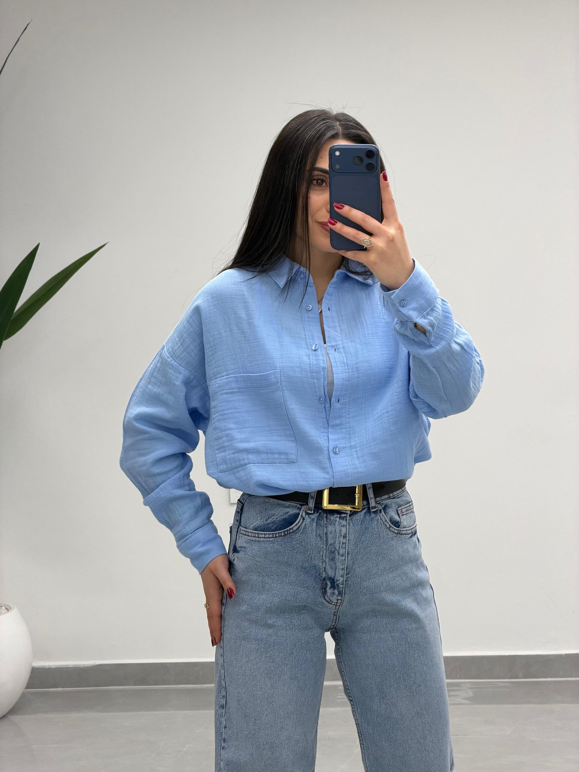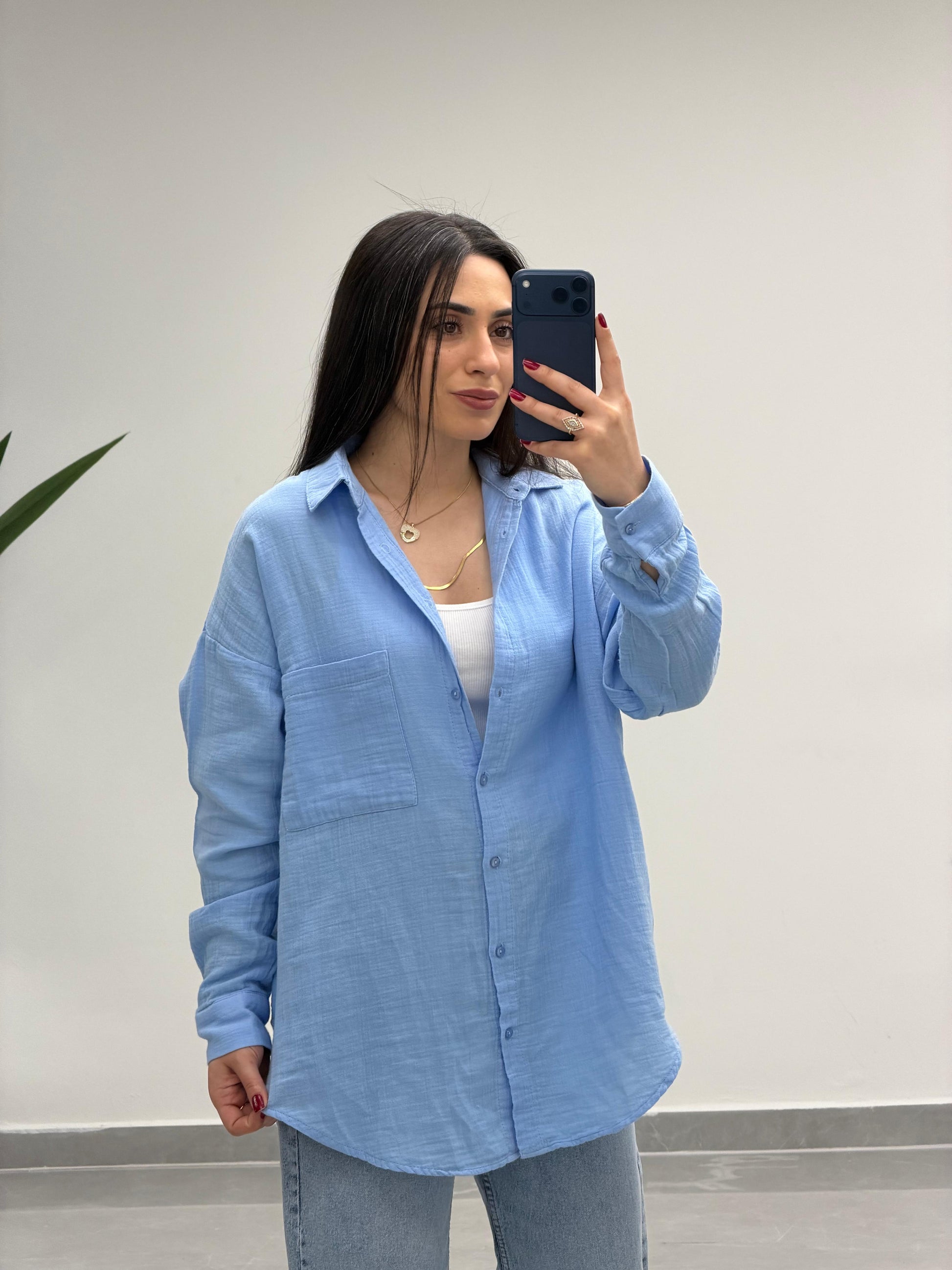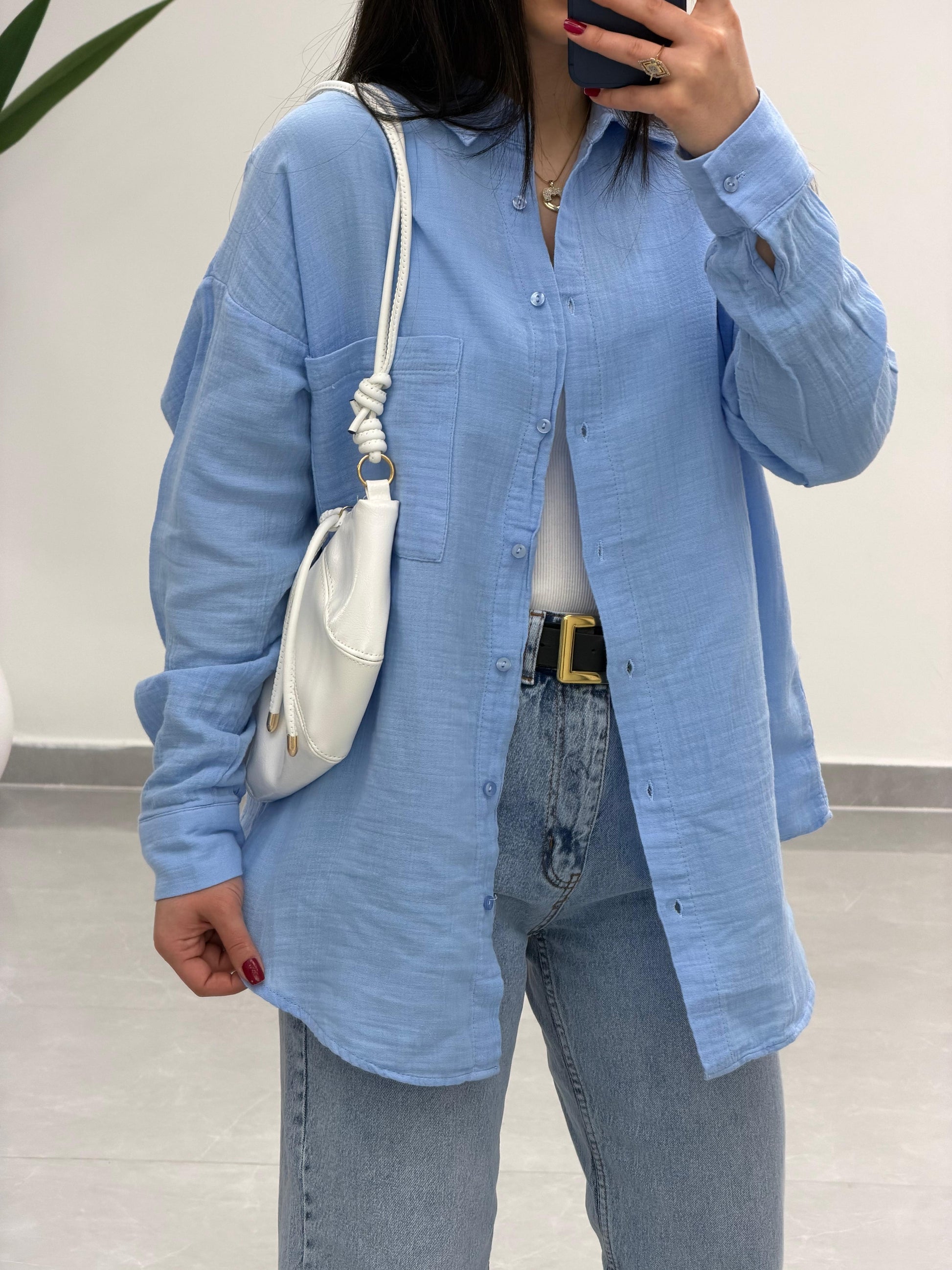 Tek Cepli Oversize Müslin Gömlek Mavi