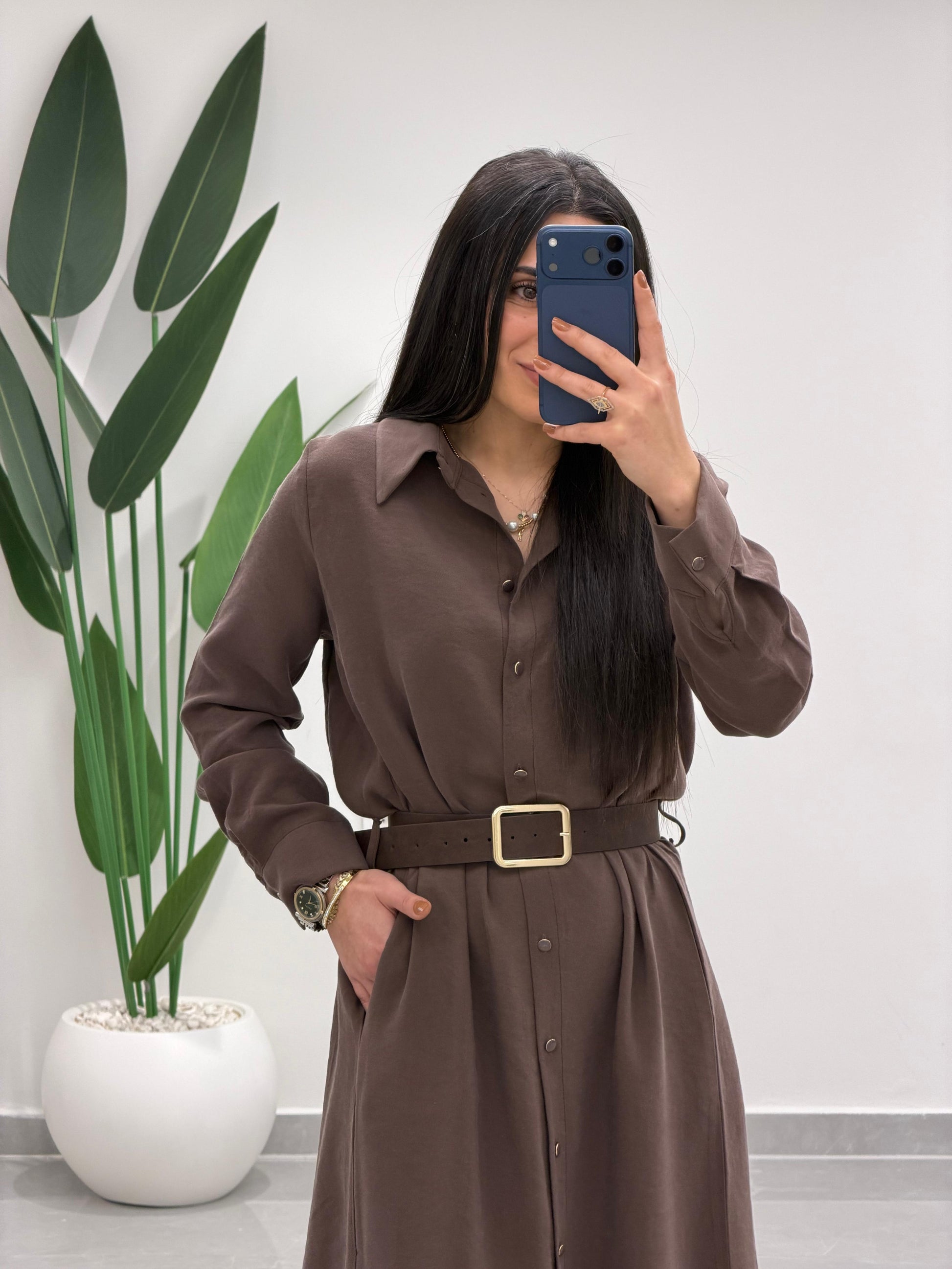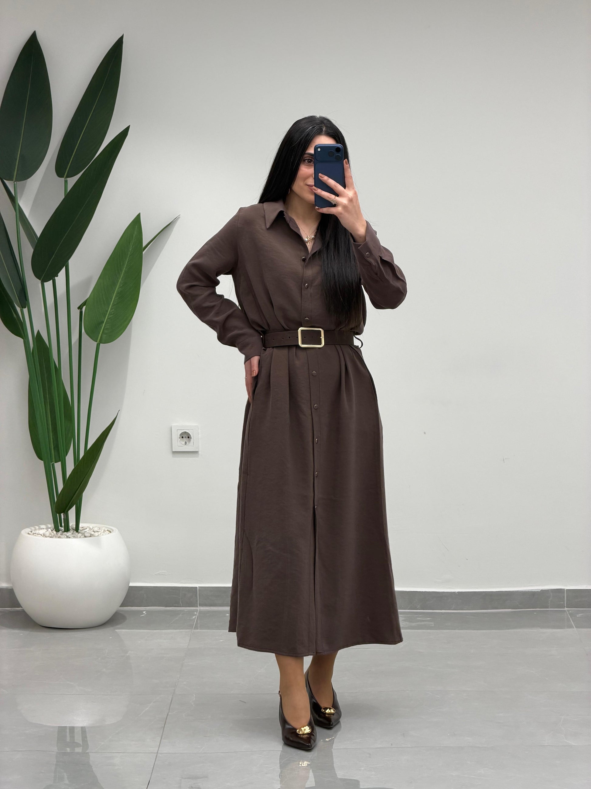 Gömlek Elbise,Düğme Kapamalı,Kemerli,Bilek Boy
