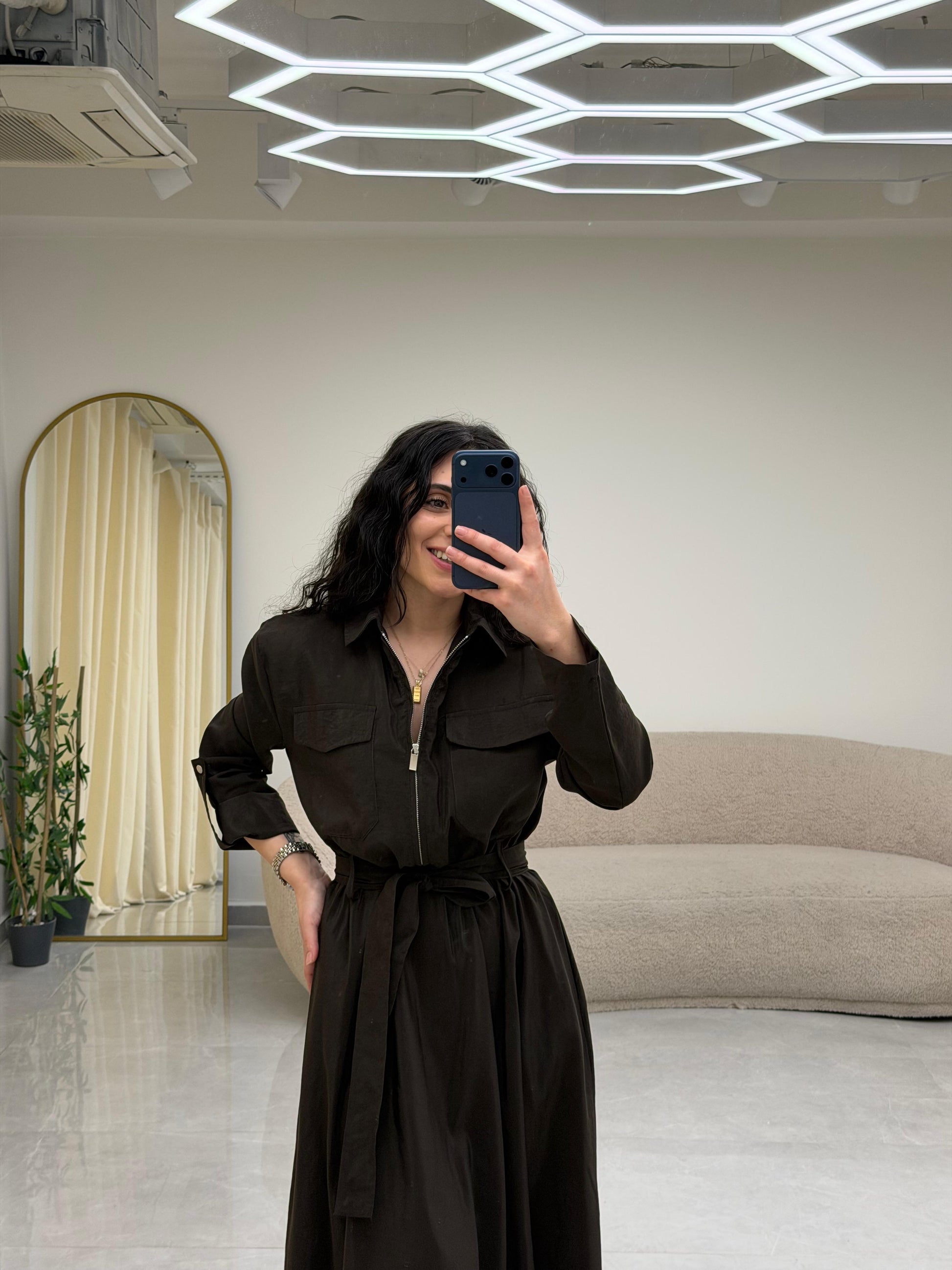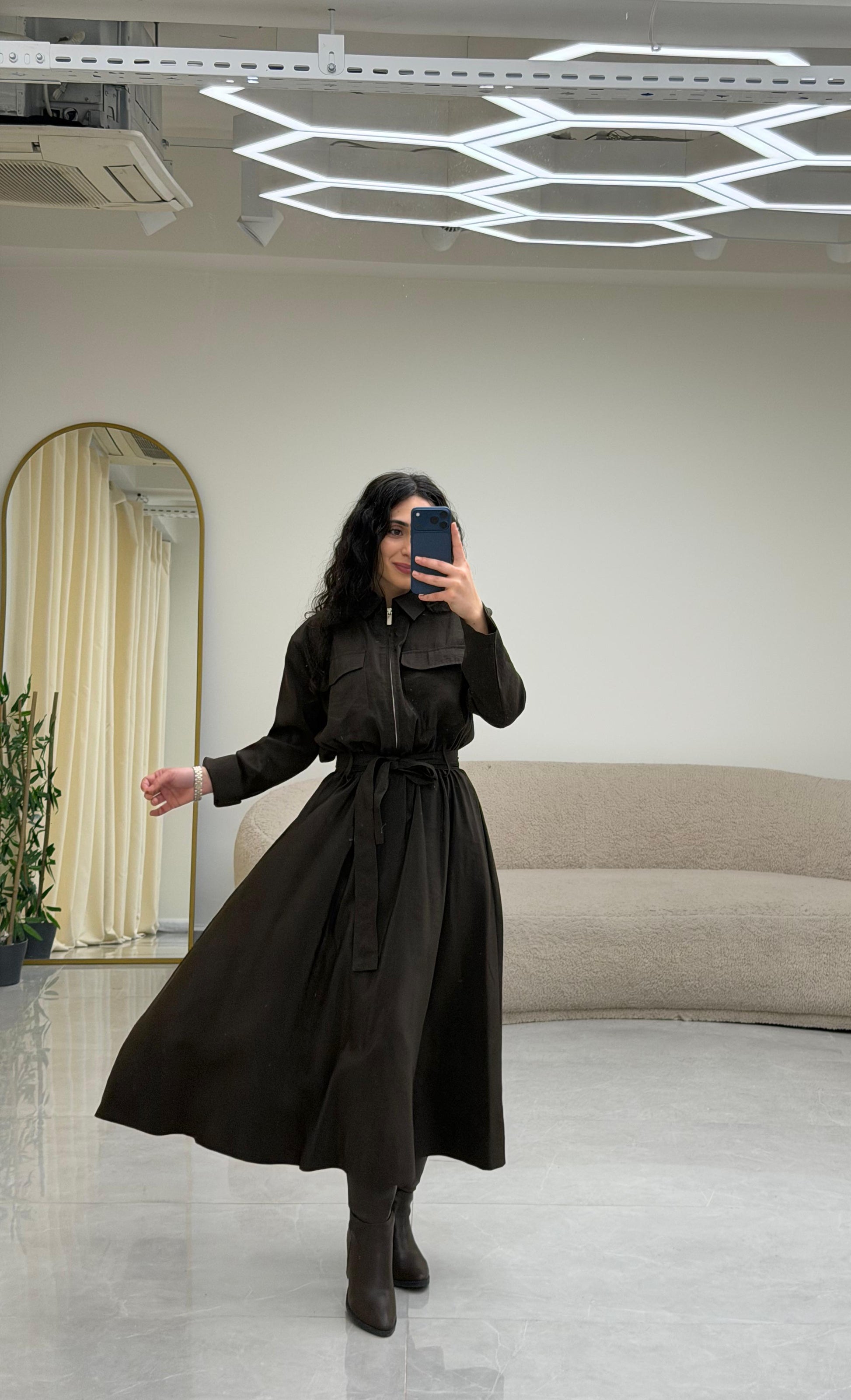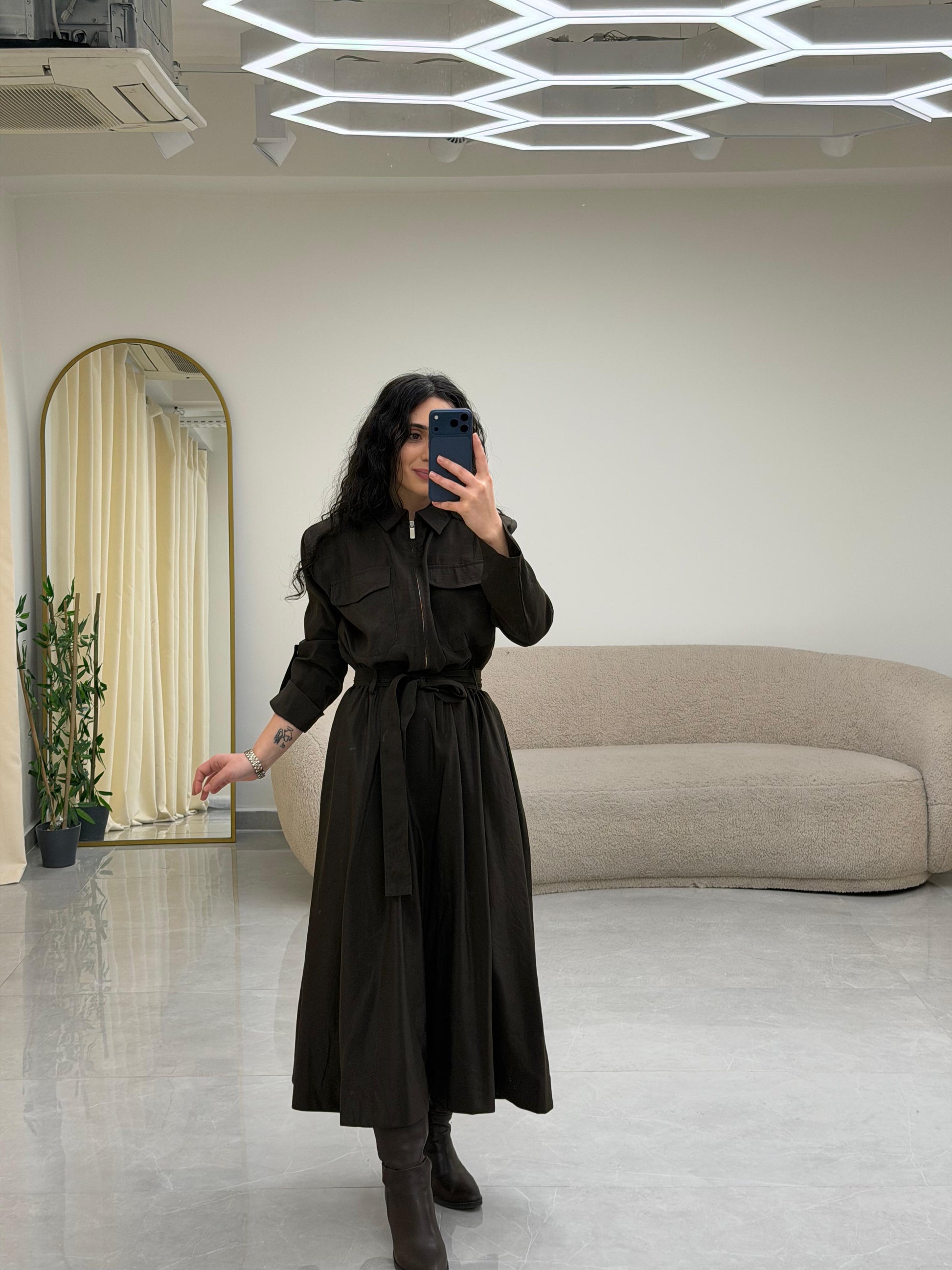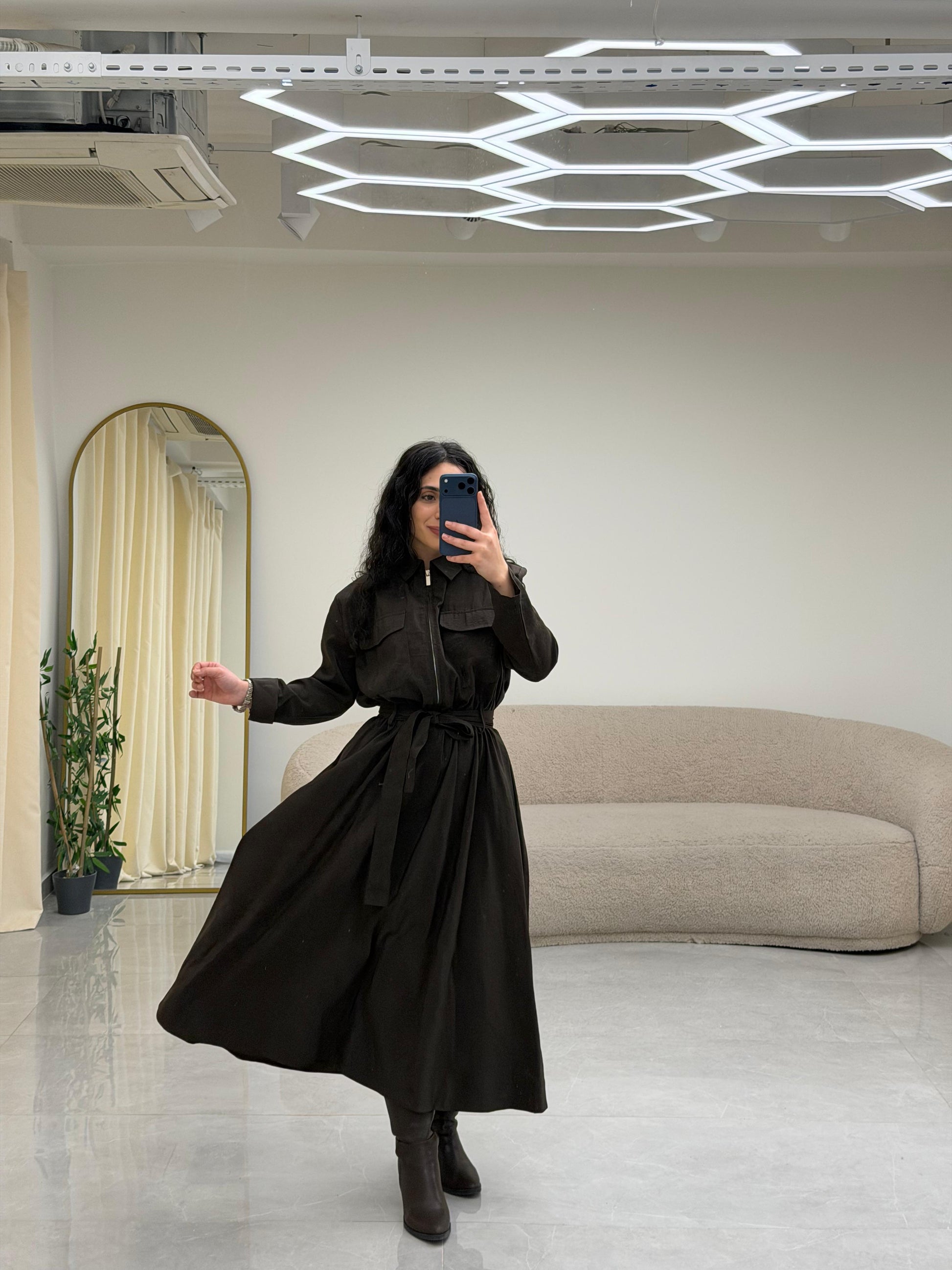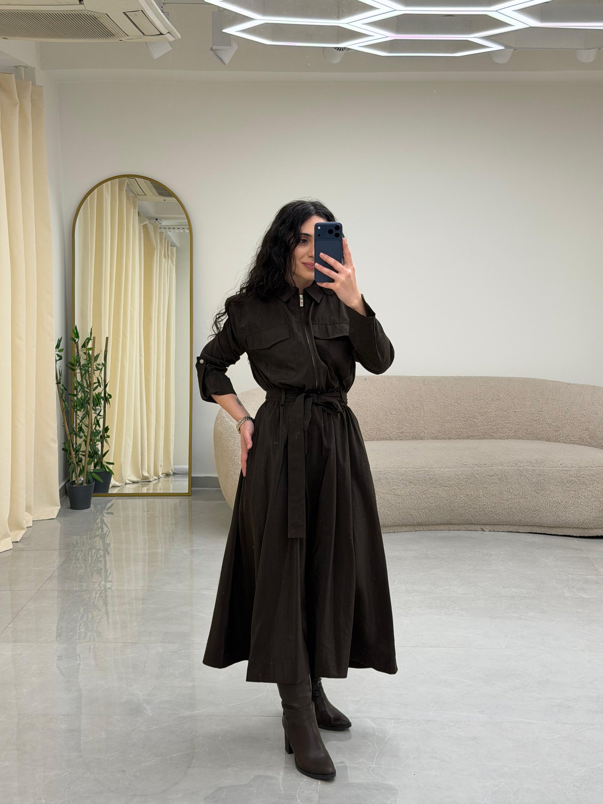 Yaka Fermuar Kemerli Elbise Kahrengi